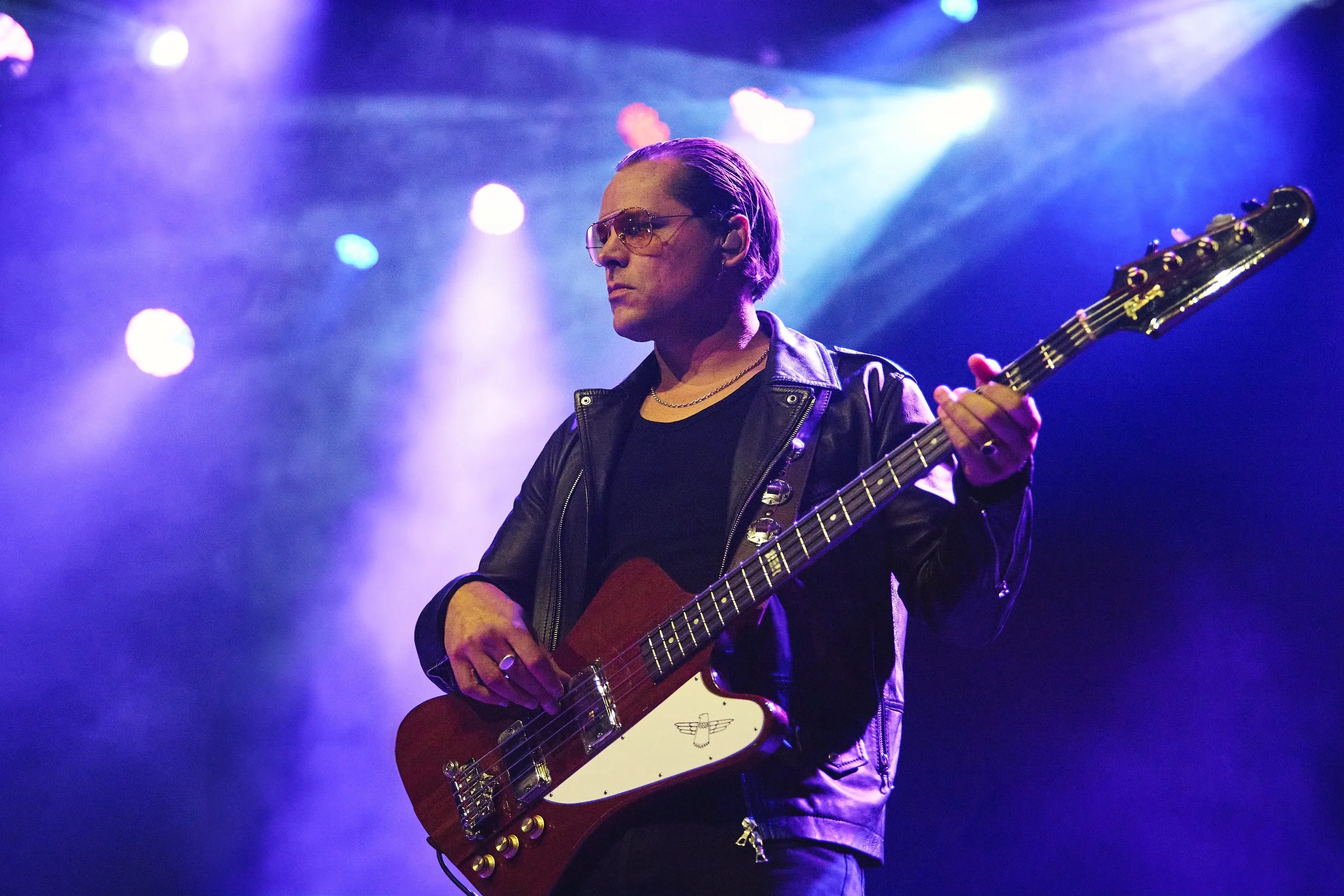 As 9 o’clock rolled round, the crowd was waiting patiently as JET took the stage. The voice behind the hits that we all know and love, we had our frontman, Nic, standing centre stage on lead vocals and guitar. Guitarist Cameron Muncey stands to his right with his iconic Flying V Gibson in hand. Mark Wilson looks effortlessly cool, leading the left of the stage sporting statement shades and adorned in head to toe black. In place as substitution for original drummer Chris Cester, we have touring drummer Pete Marin. And finally, Louis Macklin joins the band on stage playing the keys.